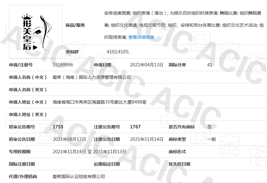 “形美皇后”商标已正式注册成功,明年ACIC亚太总部将举办“ACIC国际形美皇后大赛”。